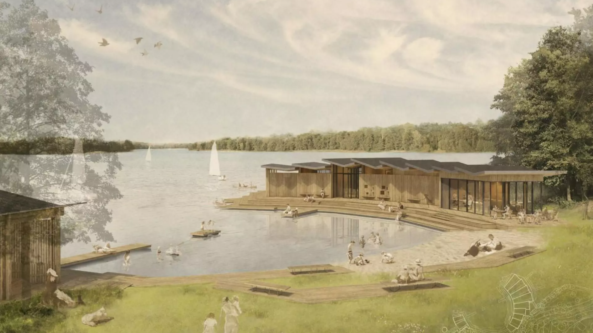 Na plaży zaplanowano przeszkloną kawiarnię, której jedna ściana w pełni się otwiera. Odwiedzający to miejsce mogą wygodnie usiąść na drewnianych dekach z ławkami, a także skorzystać z sauny z widokiem na jezioro.