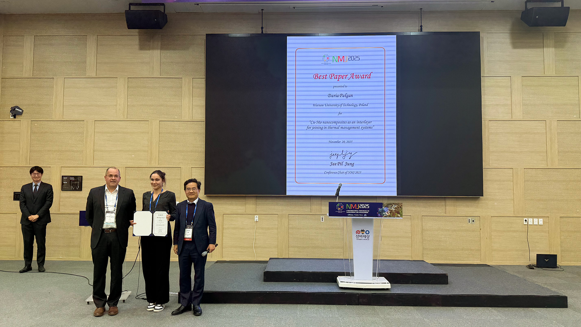Mgr inż. Daria Pałgan zdobyła Best Paper Award podczas szóstej Międzynarodowej Konferencji Nano-Joining & Micro-Joining, która odbyła się w dniach 17–21 listopada2025 roku w Yeongju, w Korei. Wstąpienie Darii nosiło tytuł „Cu-Mo nanocomposites as an interlayer for joining in thermal management systems”.